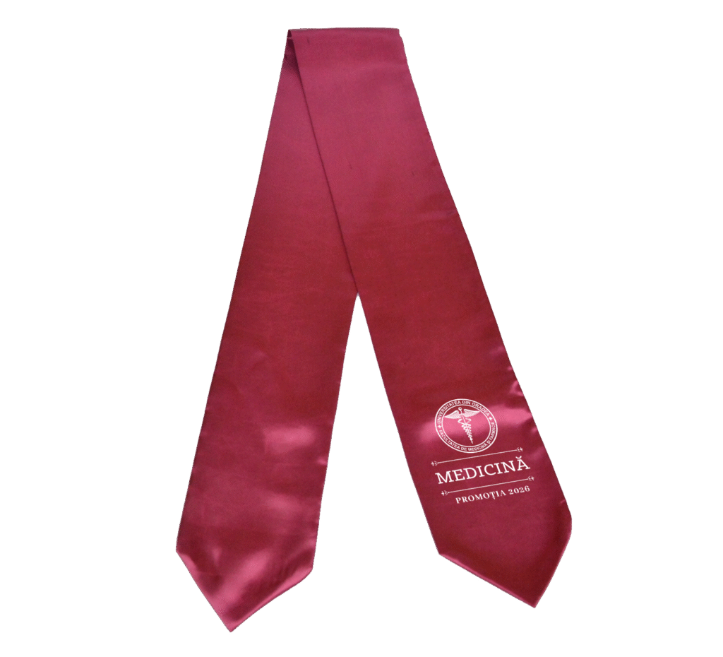 Confecționată din satin, dublu, eșarfa este disponibilă în mai multe culori. Se poate personaliza prin transfer termic sau prin serigrafie, iar culoarea acesteia se va asorta cu cea a bentiței și a ciucurelui.
