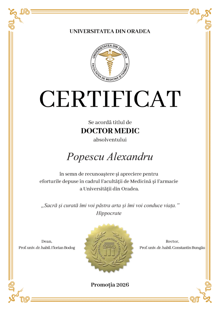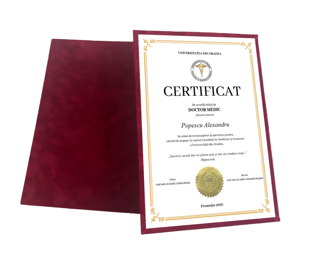 Certificatul de absolvire are acum un nou design: este realizat pe hârtie crem, la care se adaugă ramă folio de jur împrejur. Pe lângă caracteristica de unicitate, aplicarea și embosarea etichetelor aurii conferă certificatului un aspect elegant, deosebit.